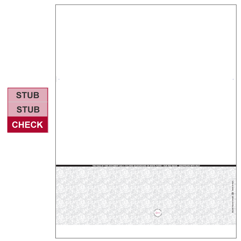 11” TruPrint High Security Laser Check Stock with a handsome, deep grey camo void design, features a bottom check position and perforations at 4″ & 7 1/2″. This classic check stock design includes more than 15 security features and adheres to the new ANSI standards. The security enhancements in this stock makes this check difficult to alter and provides businesses with the flexibility to do both accounts payable and payroll.